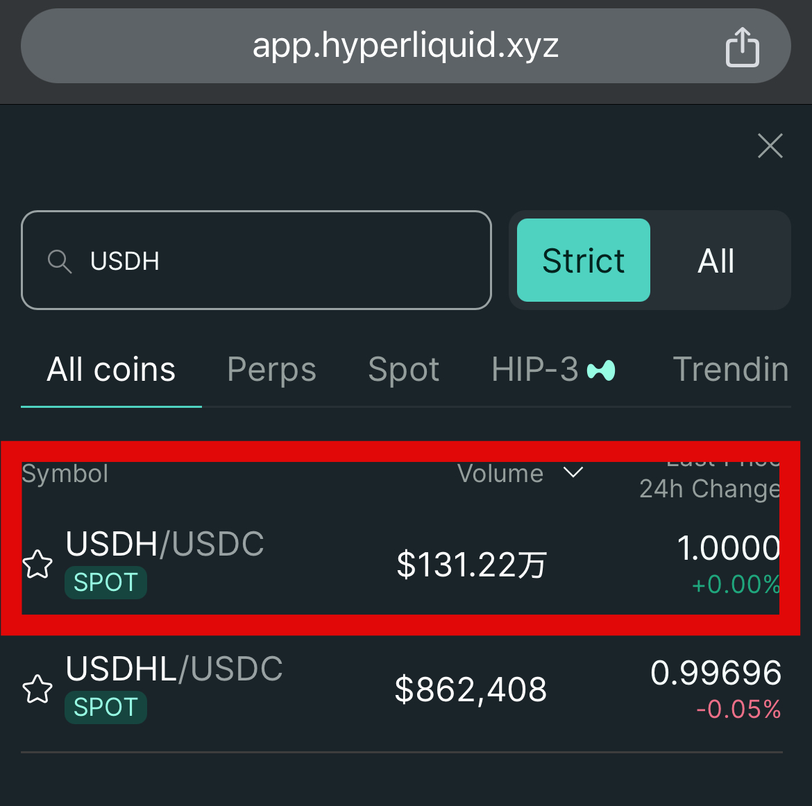 そしてHyperLiquidでUSDHはUSDCしかペアがありません。つまり、USDCと交換する必要があり、事前にUSDCを入手しておく必要があります。