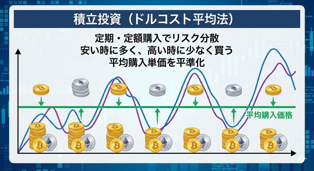 たとえば、価格が下がれば多く買え、価格が上がれば少なく買うため、平均購入価格を調整しやすい点が特徴です。値動きが大きい仮想通貨ほど、買い付けを分散する効果が期待できます。