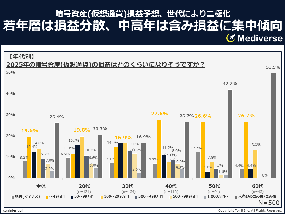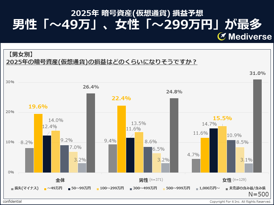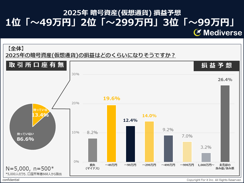 暗号資産口座保有者500名に対して、今年の損益予想を聞いたところ、未売却の含み損益(26.4%)を除くと、もっとも多かったのは「~49万円」(19.6%)となっており、「100~299万円」(14.9%)、「50~99万円」(12.4%)が続いた。