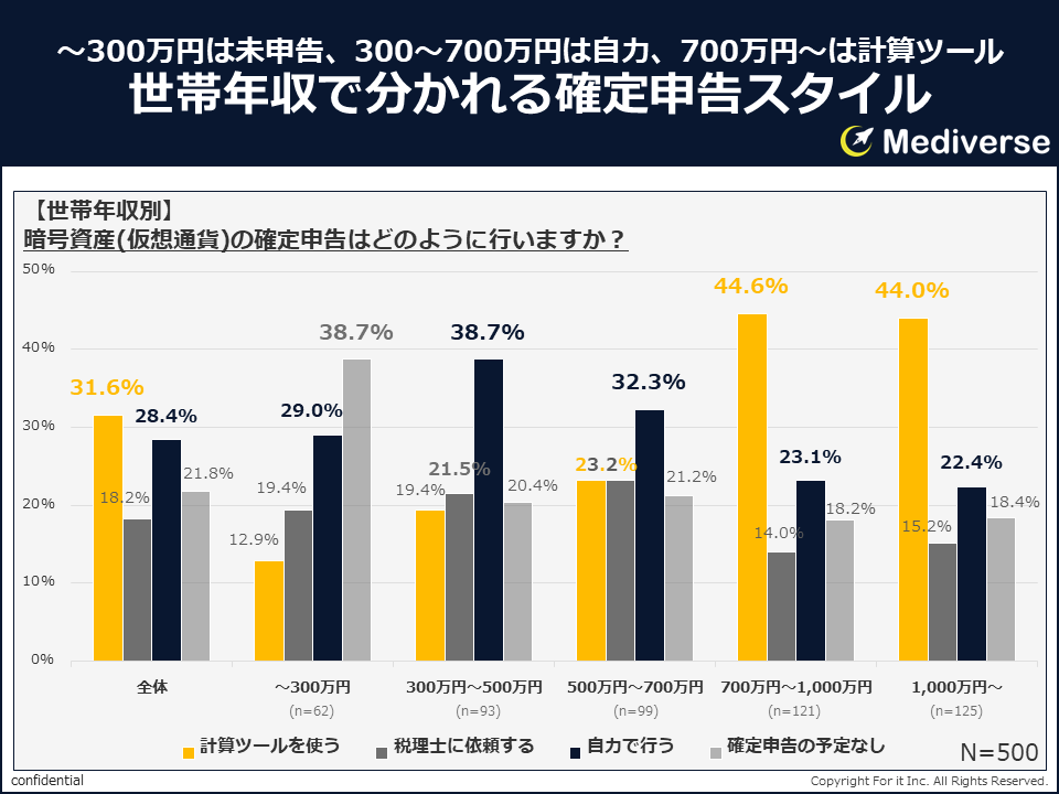 また、確定申告の進め方については、計算ツールか自力派に分かれる傾向が見受けられました。特に、30代、世帯年収700万円以上の層ではデジタルツールの利用率が高く、確定申告の効率化を重視する姿勢が強いことが見受けられます。