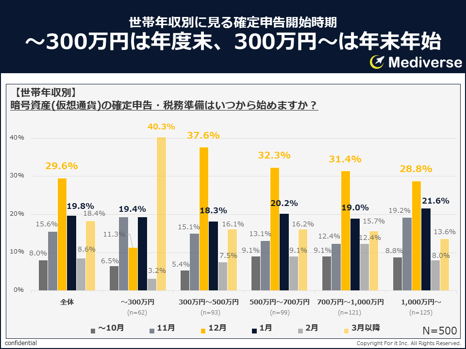 確定申告の準備開始時期においては、12月をピークに年末年始に集中しており、多くの投資家が年末の損益状況を踏まえて動き出している様子が推察されます。