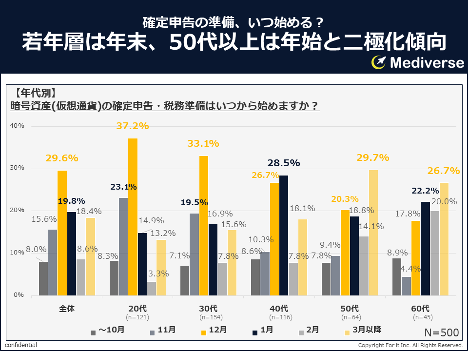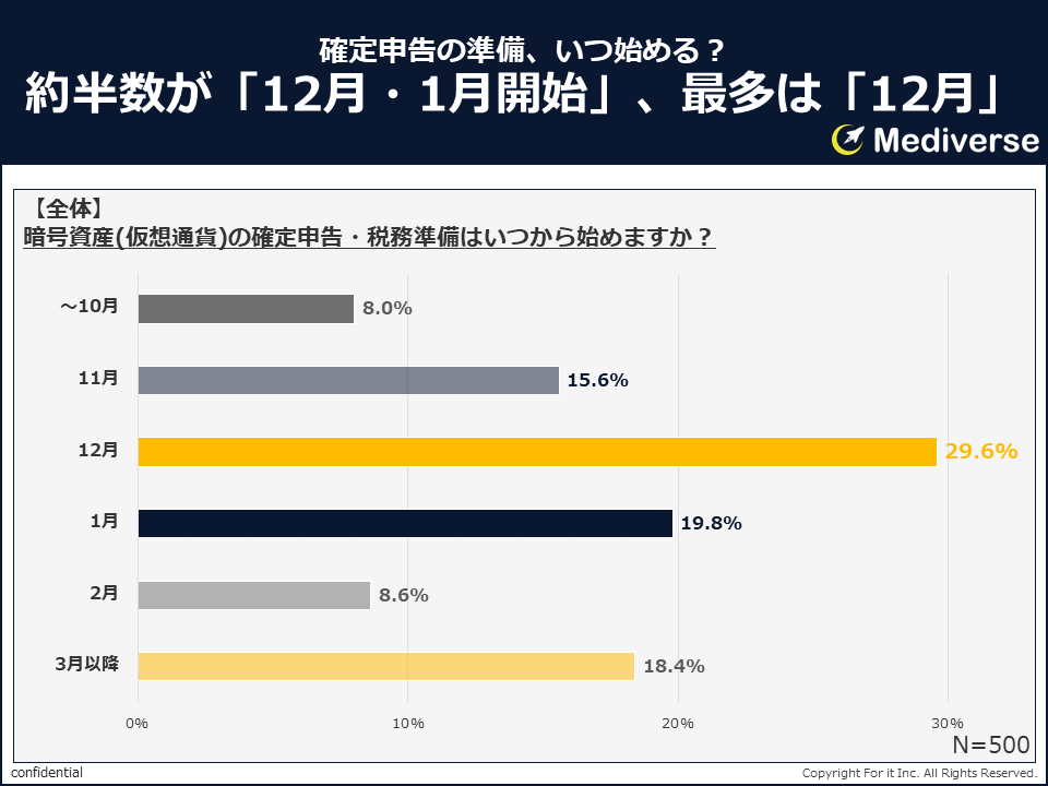 暗号資産の確定申告・税務準備について、実際にいつから始めるか聞いたところ、約3割が「12月」、約2割が「1月」と回答していた。12月・1月の2ヶ月間に約半数(49.4%)が準備を始めていることが確認できる。