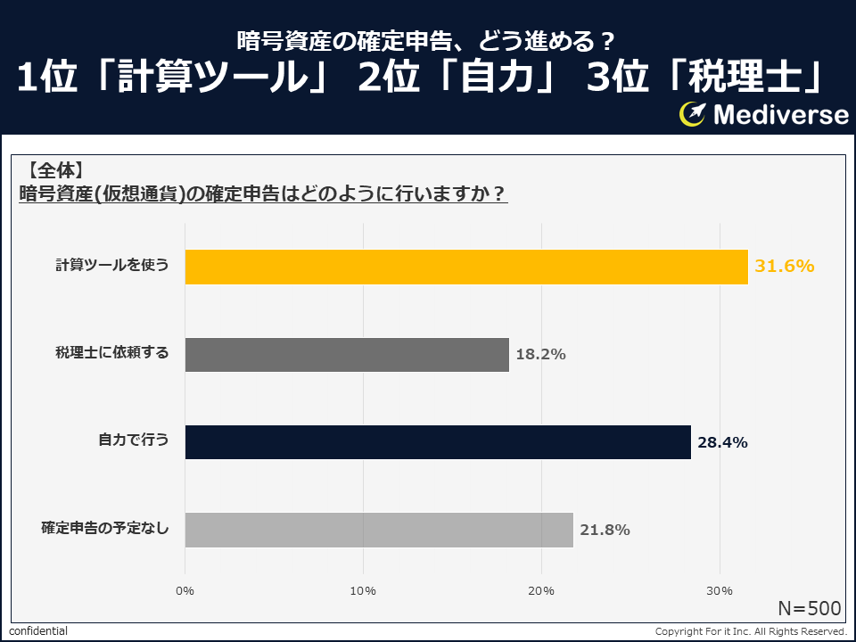 暗号資産の確定申告・税務準備について、実際にどのように行うか聞いたところ、もっとも多かったのは「計算ツールを使う」(31.6%)、その次に「自力で行う」(28.4%)と回答しており、合わせると6割に達していることがわかる。