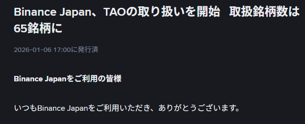 Binance Japanでは、TAO(Tao)およびFET(Fetch.ai)の日本円建て取引ペアが新たにスタートしました。キャンペーン期間中は、両ペアの取引所取引におけるメイカー手数料が割引されます。