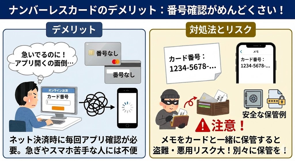 特に、スマホ操作が苦手な人や、ネット決済でカード番号を頻繁に入力する人にとっては不便かもしれません。一方で、スマホ操作に慣れている人なら、利用明細や番号確認をまとめて管理できるため、むしろ安心で便利と感じるケースもあります。