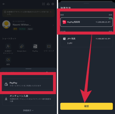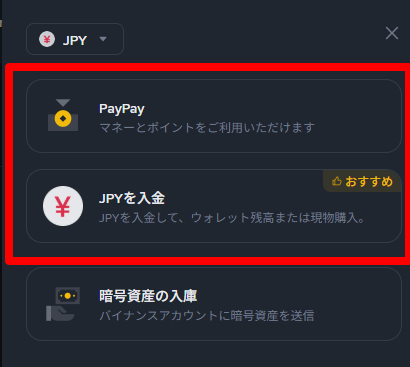 まずは「日本円(銀行振込・PayPay)」を選択しましょう。バイナンスの口座にJPY現物を入れ、そこからビットコインなどを購入する流れになります。
