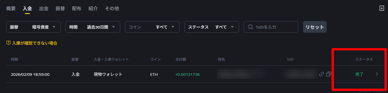 ここで「手動でアカウントに入金」というリンクをクリックすることで、初めてあなたのウォレット残高に資金が反映されます。手続きが完了すると、履歴のステータスが「完了」に変わります。これで無事に入庫完了です!