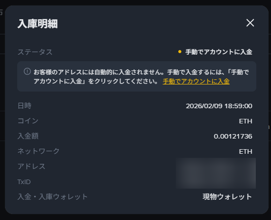 情報の送信が終わると、入庫明細のステータスが「手動でアカウントに入金」という表示になります。