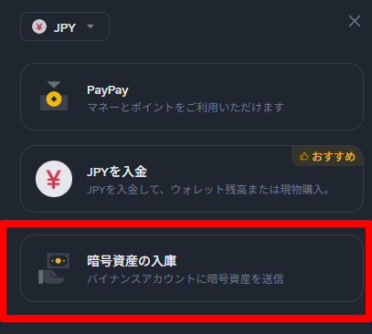 ビットコインやBNBなどを直接バイナンスに送る「暗号資産の入庫」が効率的です。