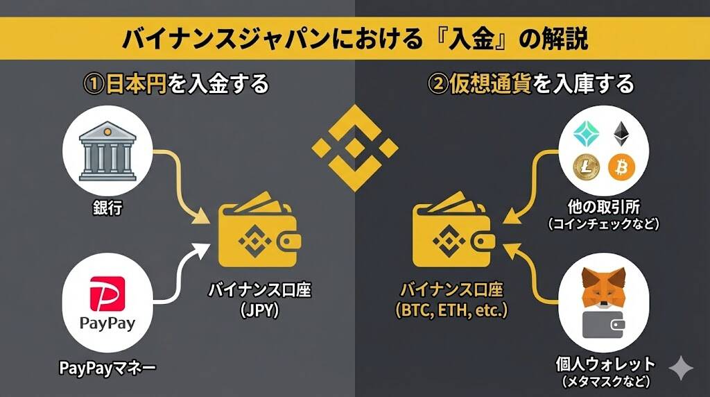 バイナンスジャパンにおける「入金」とは、アカウント内へ資産(日本円または仮想通貨)を追加する操作を指します。具体的には、大きく分けて以下の2つのパターンが存在します。
