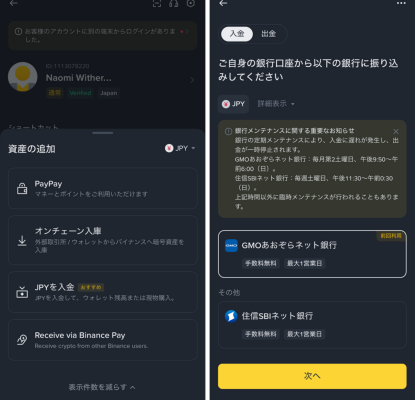 私はスマホアプリの「三菱東京UFJ銀行」から入金しています。ここで表示されたGMOあおぞらネット銀行、もしくは住信SBIネット銀行のバイナンスの口座に入金すると、しばらくしてバイナンス口座にJPYが反映される仕組みです。