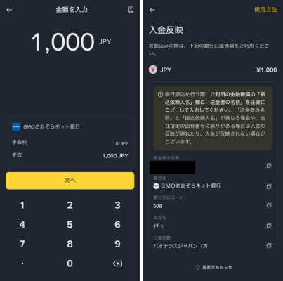 ・日本円入金は銀行振込とPayPayに対応。手数料は無料で、銀行営業時間内なら最短数分~1営業日で反映
