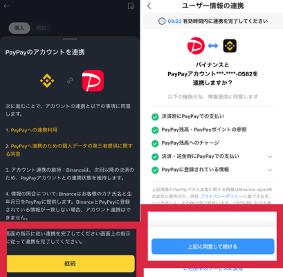 買いたい金額を入力すると、PayPayアプリが起動してBianceアプリと連携を求めてきます。