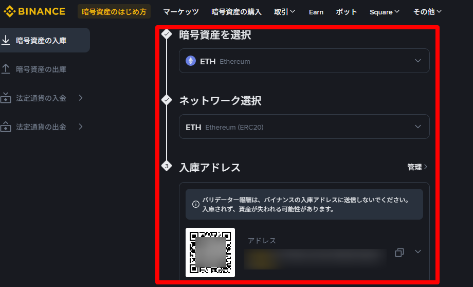 「メタマスクやPhantomに入っている資産をバイナンスに移したい」「他の取引所から送金したい」という場合は、仮想通貨の「入庫(オンチェーン送金)」を利用します。