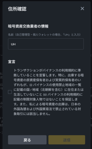実際にメタマスクやPhantom(ファントム)などの自分専用ウォレットから送る際、バイナンスジャパンでは日本の法令に基づき、追加の「情報提供」が求められます。