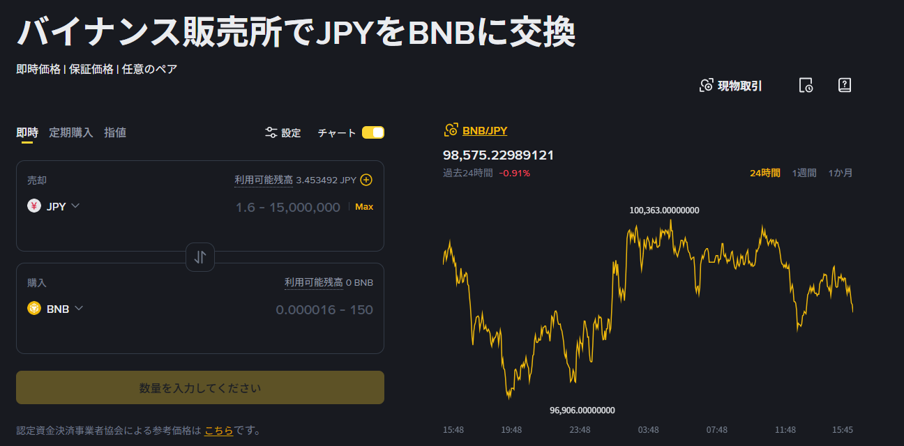 チャート分析などは不要です。1クリックで日本円をビットコインやBNBに交換できる「販売所」機能を使って、まずは少額から購入を体験してみましょう。簡単に購入できる代わりにスプレッドと呼ばれる手数料がかかります。