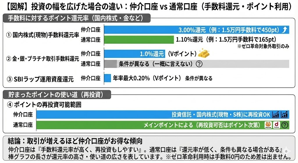 ただし注意点もあります。国内株式の売買手数料が0円になる「ゼロ革命」を利用している場合は、仲介口座でも通常口座でも手数料が発生しません。そのため、この場合は手数料に対するポイント付与自体がなく、口座の違いによる差も生まれません。