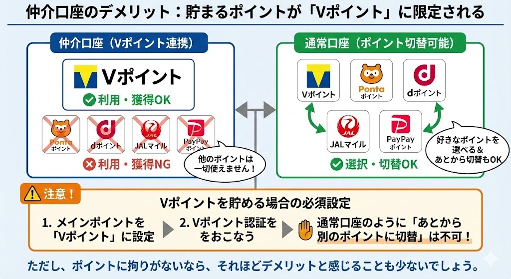 | 仲介口座に向かない人 | ・Pontaポイントやdポイント、PayPayポイント、JALマイルなど、三井住友経済圏以外のポイントをメインにしている ・将来的に貯めるポイントを変更する可能性があり、ポイントを固定したくない |