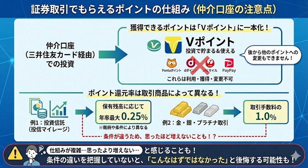 ポイント制度をよく理解しないまま仲介口座を選んでしまうと、「こんなはずではなかった」と後悔することもあります。三井住友カード経由で開設する仲介口座では、投資で獲得できるポイントが、Vポイントに一本化される点が大きな特徴です。