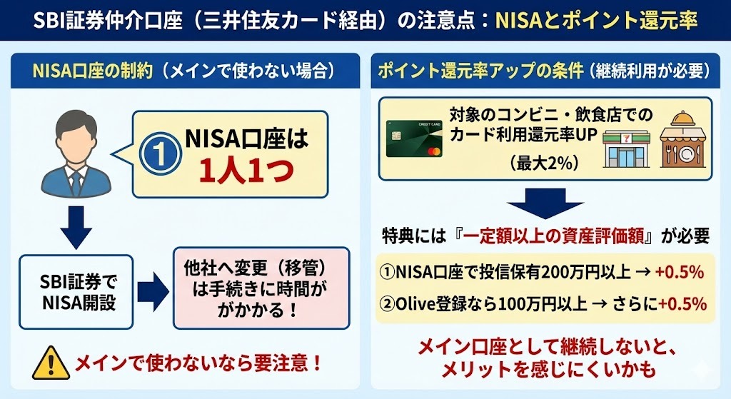 ポイント還元や連携特典に惹かれ、三井住友カード経由でSBI証券を開設する人も多いでしょう。しかし、仲介口座はキャンペーンなどが手厚い一方で、獲得ポイントや経済圏において制限がかかるケースがあります。