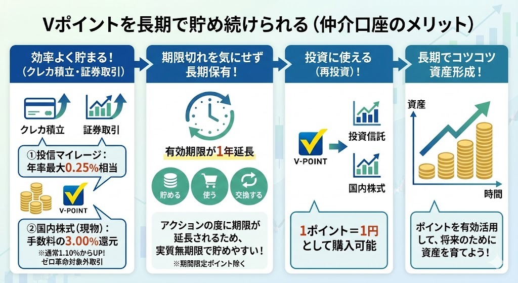 仲介口座にはデメリットがある一方で、いくつかのメリットもあります。とくにVポイントを継続して貯めたい人や、クレカ積立を中心に投資を続けたい人にとって、嬉しいメリットについても詳しく見ていきたいと思います。