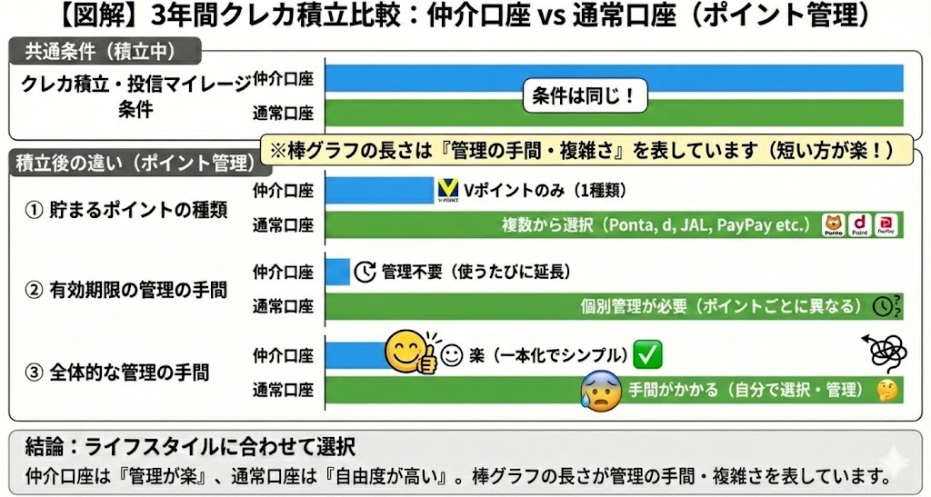 「ポイントが付くかどうか?」「何%付与されるか?」は、口座の種類ではなく三井住友カードの種類や条件で決まります。差が出るのは、クレカ積立を続けたあとです。仲介口座では、投信マイレージや各種特典で貯まるポイントがVポイントに集まります。