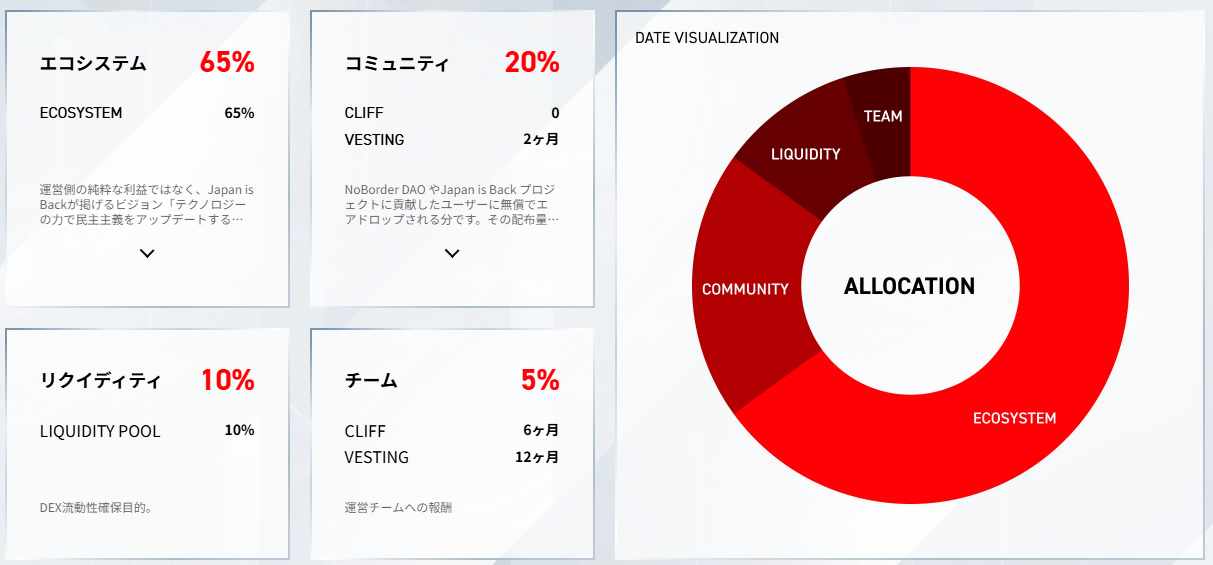 元々はYouTube番組「NoBorder」を軸とし、「Japan is Back」というスローガンのもとで民主主義のアップデートを目指す参加型インセンティブトークンとして企画されたと説明されています。