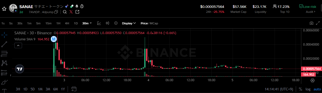 「私は全く存じ上げません」「事務所も承認を与えていない」と明言したことで、サナエトークンの価格は短期間で暴落しました。この発言により、「承認を得ずに政治家一個人の名前や画像を使用されたミームコイン」であることが判明しました。