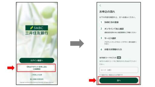まずは三井住友銀行アプリを起動し、トップ画面から「Oliveアカウントを申し込む(口座開設)」を選択します。「お申し込みの流れ」画面まで遷移し、「次へ」を選択します。