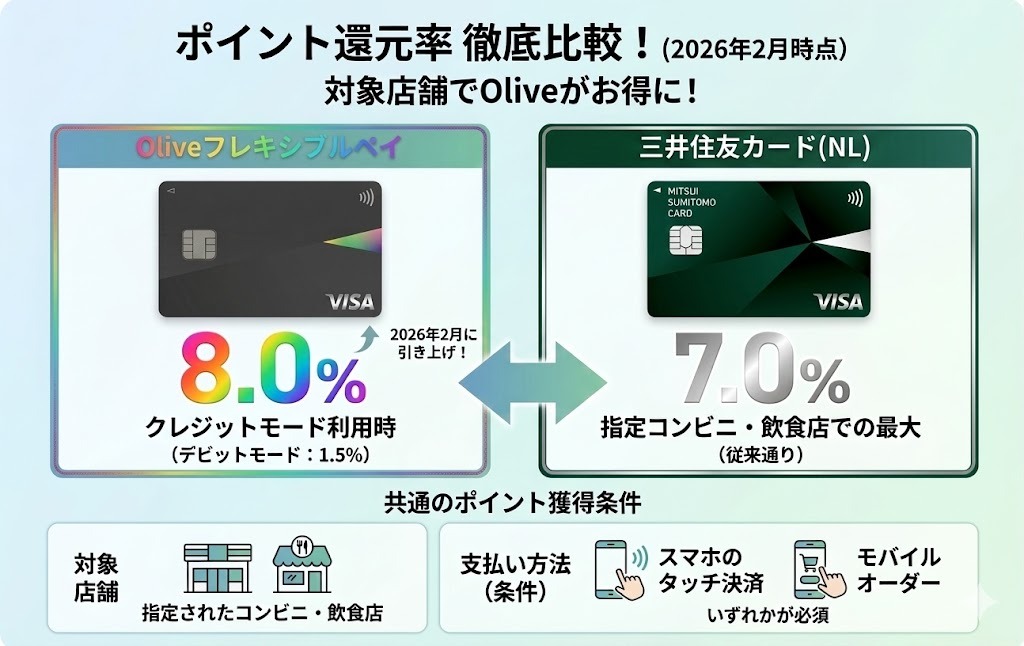 三井住友カードの対象カードは、指定されたコンビニ・飲食店で最大8.0%分のポイント還元を受けられます。従来は最大7.0%でしたが、2026年2月にOliveフレキシブルペイは8.0%に引き上げられました。その他は据え置かれたため、還元率に差が生じています。