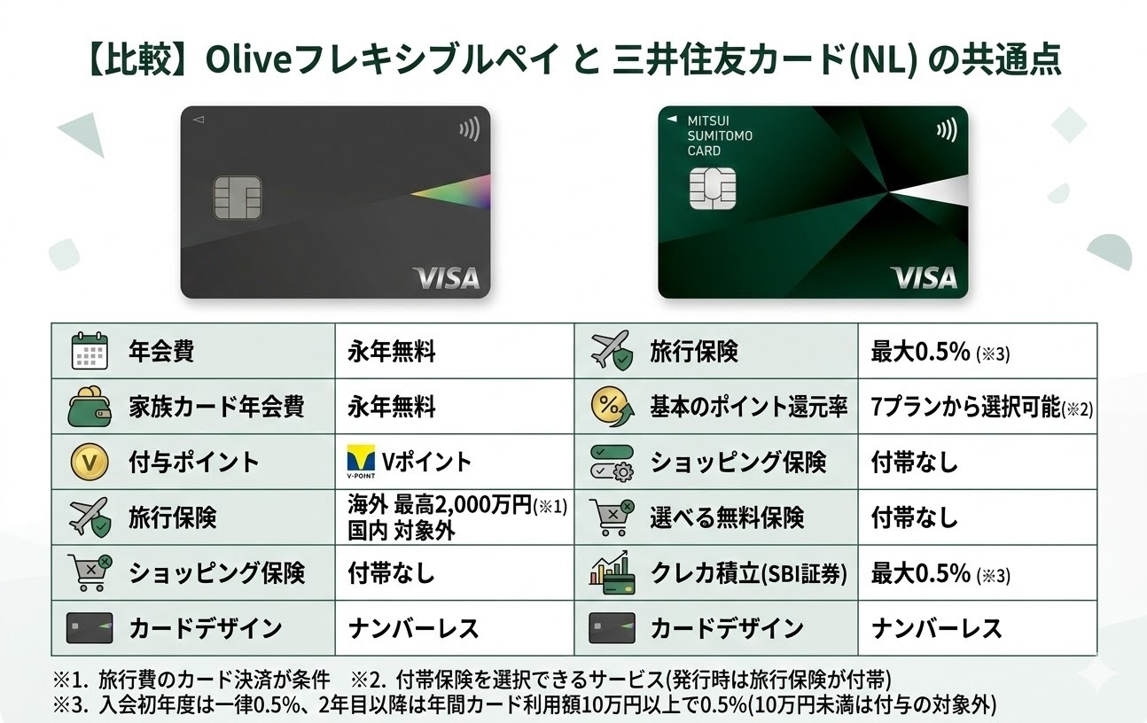 | 【Oliveフレキシブルペイと三井住友カード(NL)の共通点】 ・年会費:永年無料 ・家族カード年会費:永年無料 ・付与ポイント:Vポイント ・基本のポイント還元率:0.5% ・旅行保険:海外は最高2,000万円(※1)、国内は対象外・「選べる無料保険」(※2):7プランから選択可能 ・ショッピング保険:付帯なし ・クレカ積立の還元率(SBI証券):最大0.5%(※3) ・カードデザイン:ナンバーレス ※1.旅行費のカード決済が条件 |