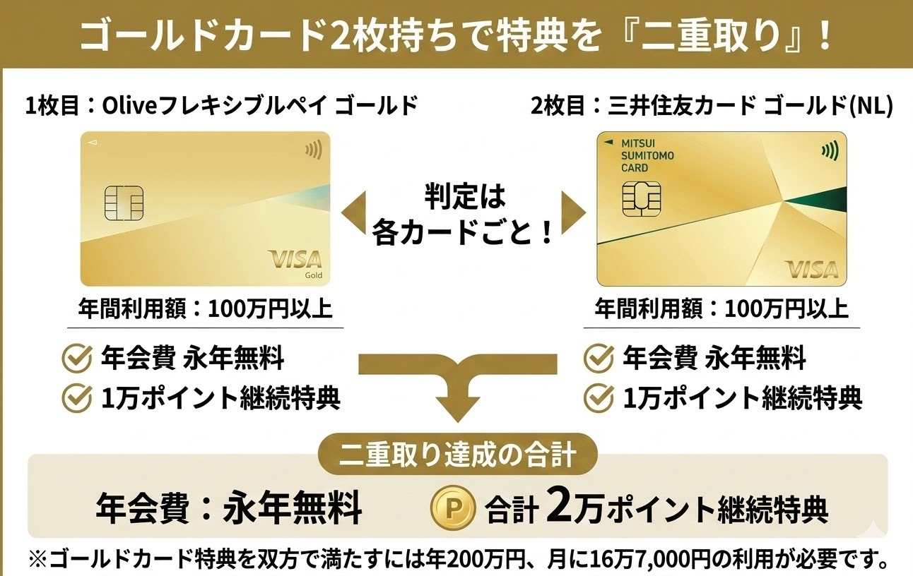 これらゴールドカードの特典は、各カードごとの判定です。つまり、Oliveフレキシブルペイ ゴールドと三井住友カード ゴールド(NL)の双方で達成すれば、いずれも年会費が無料になり、かつ計2万ポイントを受け取ることができます。