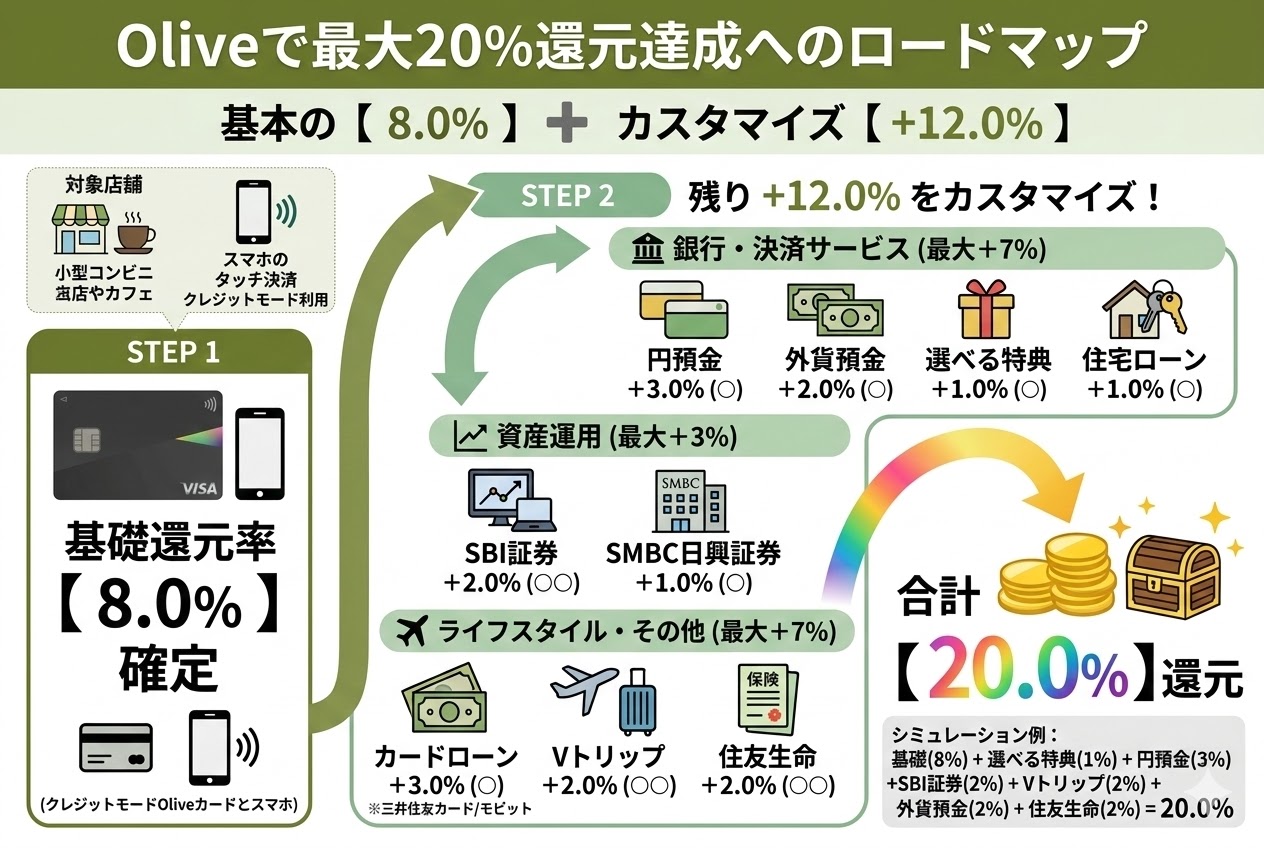 出所:Oliveフレキシブルペイ、三井住友カード(NL)、三井住友カード 対象のコンビニ・飲食店で最大8%還元!、三井住友カード Vポイントアッププログラム、三井住友銀行 Olive アカウント規定、三井住友カード インターネットで口座振替設定が可能な金融機関一覧