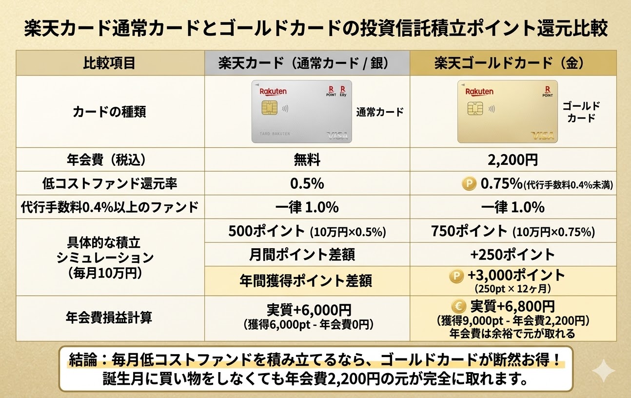 特に低コストなファンド(代行手数料0.4%未満)を積み立てる場合、通常の楽天カードの還元率(0.5%)と比較して有利な設定となっています 。毎月一定額を長期的に積み立てる資産形成層にとって、この0.25%の差は長期間で大きなリターンを生み出す要素となります。