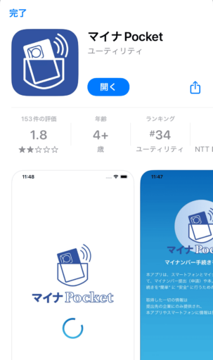 マイナPocketをダウンロードしたら「開く」をタップしましょう。