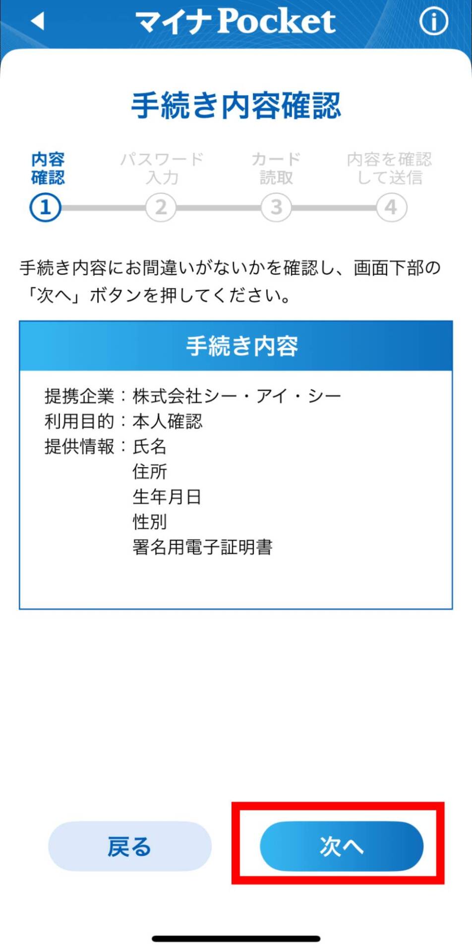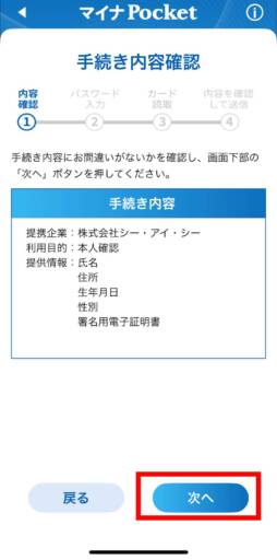 手続き内容が確認されるので、問題なければ「次へ」をタップします。