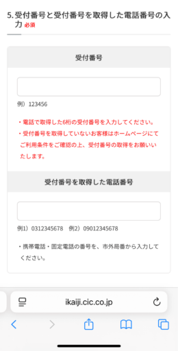 CICの公式サイトに戻り、上記画面が表示されます。先ほど電話にて取得した受付番号と電話番号を入力し「インターネット開示の申込を行う」をタップします。