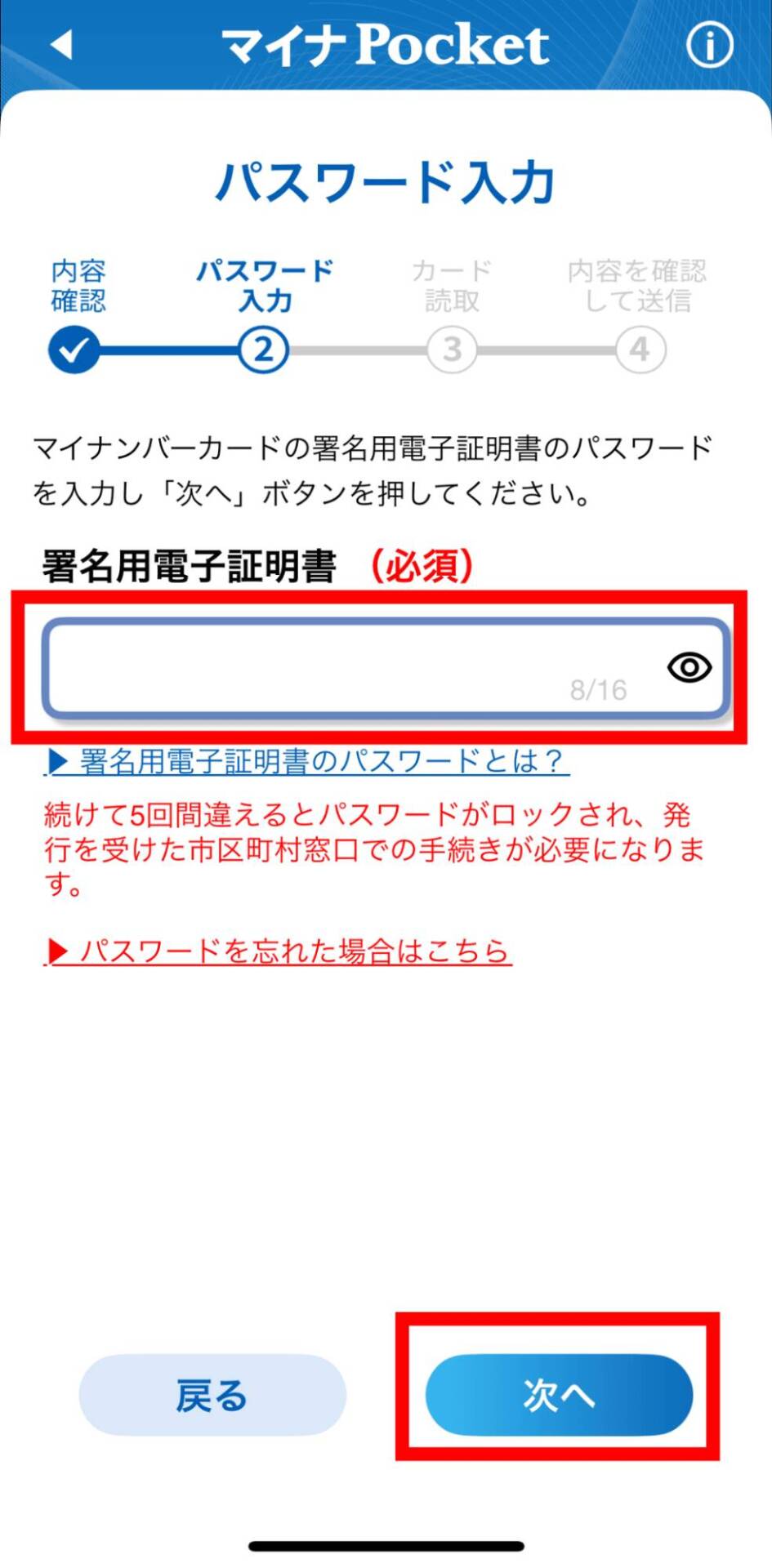 マイナンバーの署名用パスワードを入力して「次へ」をタップします。