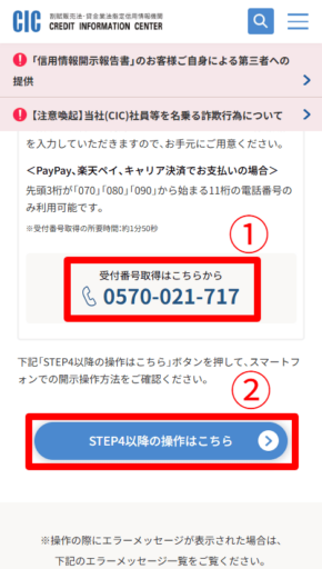 再度CICの公式ページに移動したら、上記の画面が表示されるまでスクロールします。次に、表示されている電話番号にかけて受付番号を取得します。電話中に決済で使うカードや電子マネーの情報を入力することがあるので、事前に用意しておきましょう。