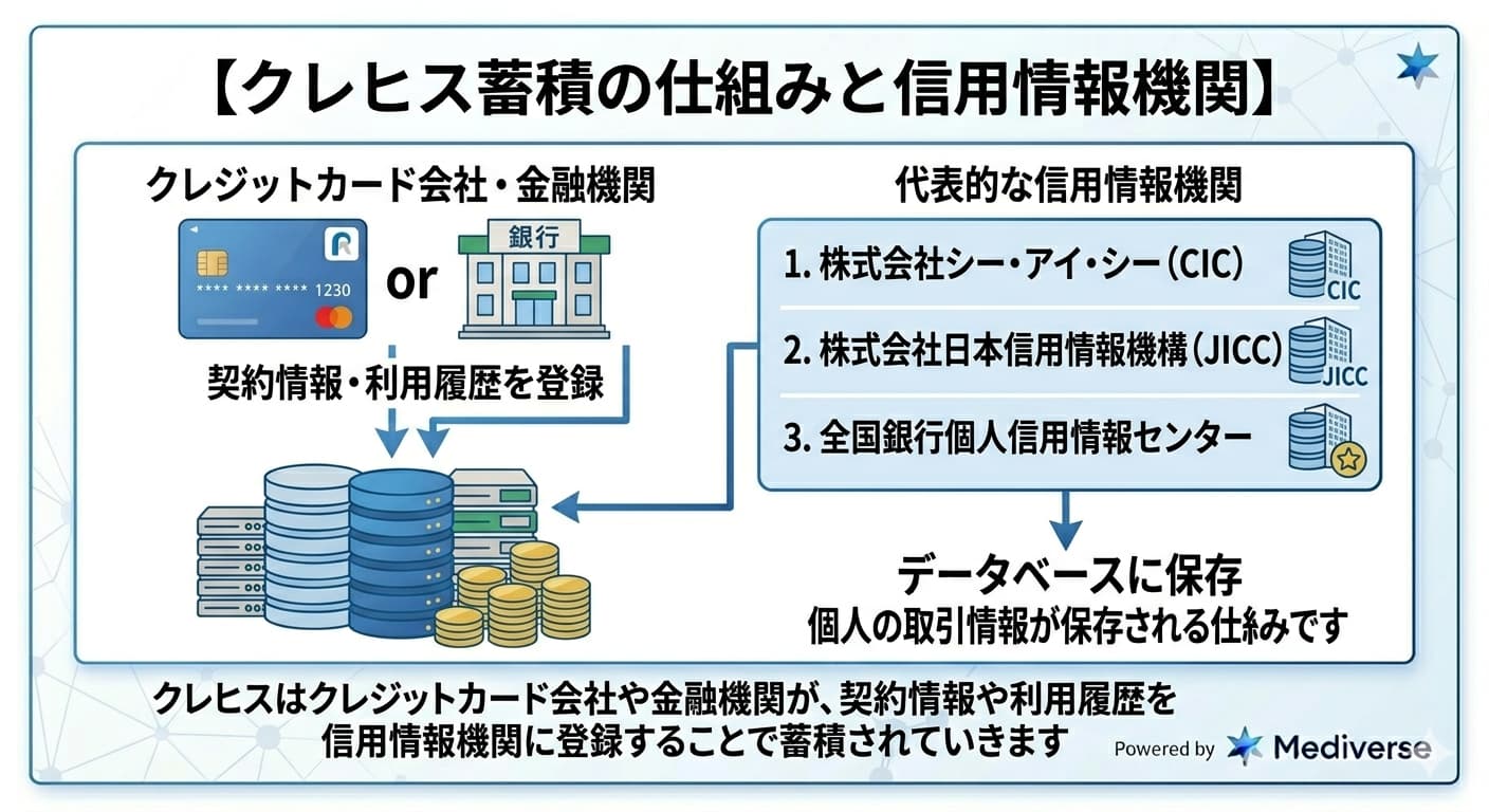 クレヒスはクレジットカード会社や金融機関が、契約情報や利用履歴を信用情報機関に登録することで蓄積されていきます。代表的な信用情報機関は以下の3つです。