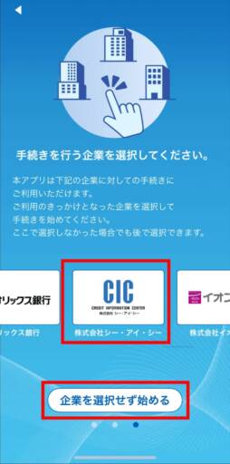 アプリの説明通り進めると、企業の選択画面が表示されます。こちらは「CIC」か「企業を選択せず始める」のいずれを選んでも問題ありません。