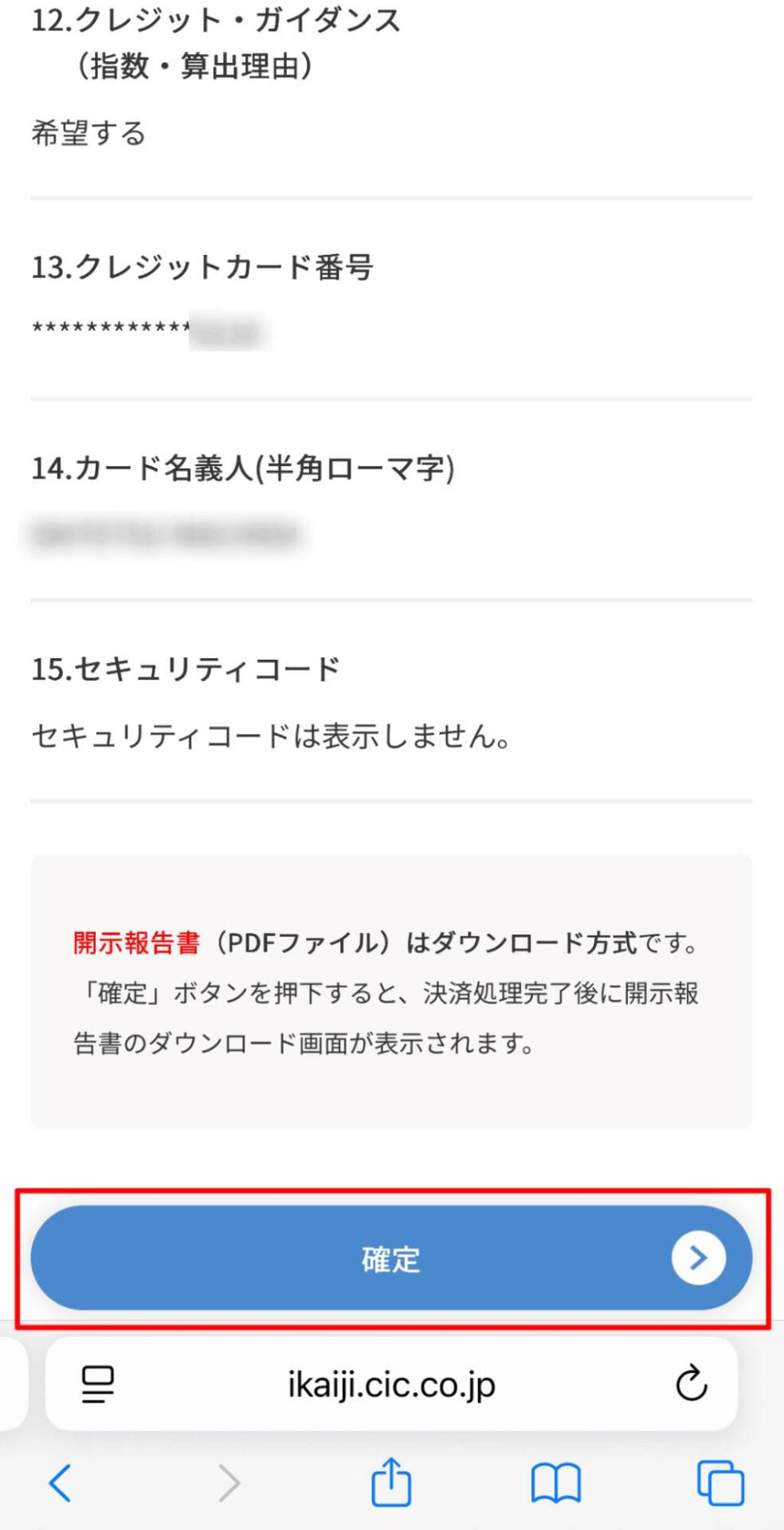 最後に内容を確認し「確定」をタップすると、クレヒスを確認できます。なお、開示情報はダウンロードすることも可能です。